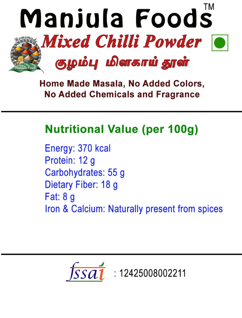Bring true South Indian flavour to your kitchen with Manjula Foods Authentic Mixed Chilli Kulambu Milagai Thool — a traditional curry masala crafted from a perfect blend of premium dry chillies, spices and aromatic ingredients. Inspired by homemade recipes, this spice mix infuses every dish with deep, rich taste and authentic aroma.