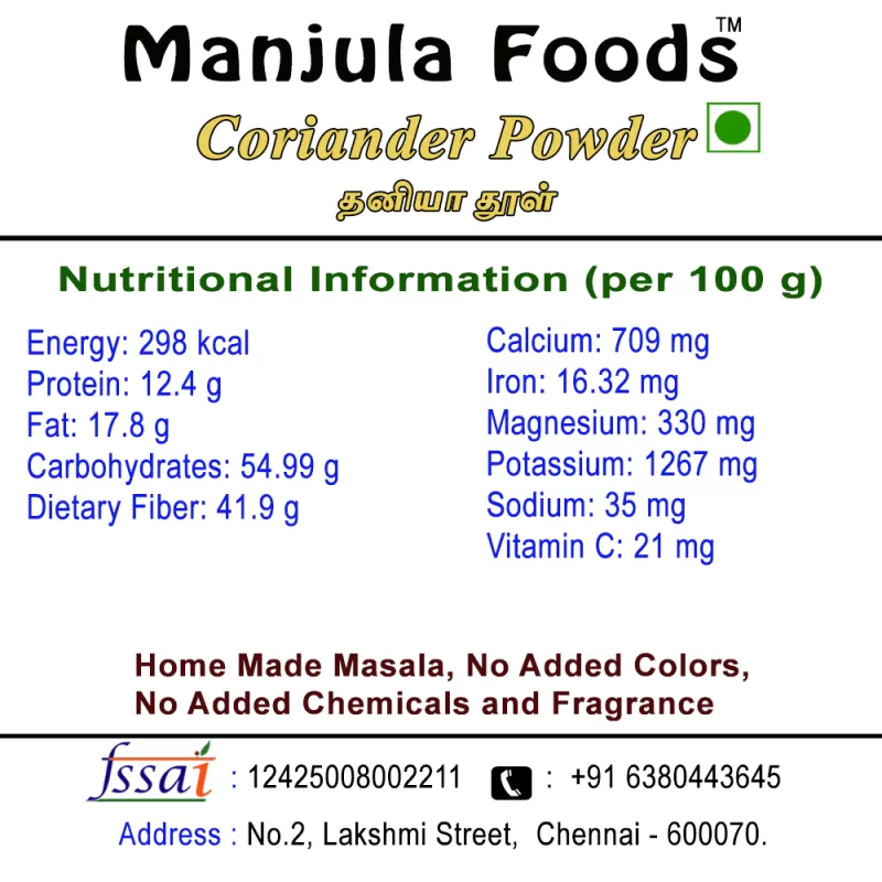 Enhance the flavour of your everyday cooking with Manjula Foods Farm Fresh Coriander Powder, the perfect kitchen essential made from premium quality coriander seeds. Known as Dhaniya Powder in Indian households, this spice adds a mild, earthy aroma and subtle citrusy notes that beautifully elevate dals, curries, gravies, marinades and more.
