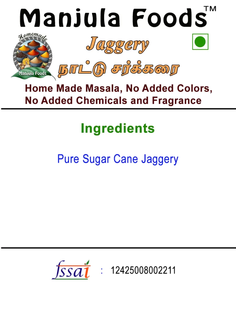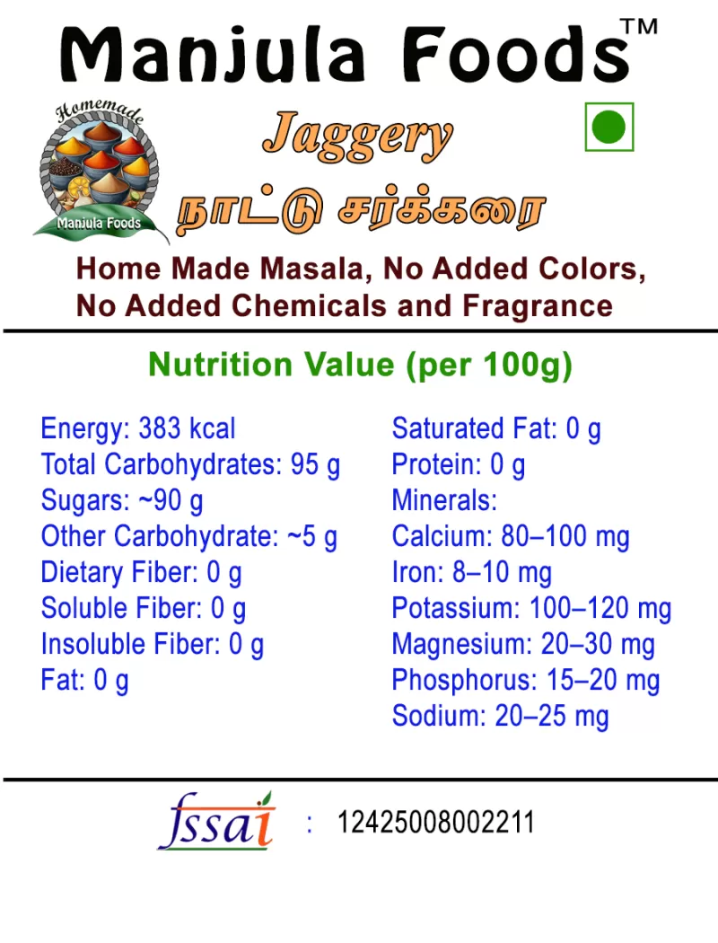 Product Ingredients – Pure Cane Jaggery Contains only natural jaggery powder with no added chemicals, preservatives, artificial colors, or additives.