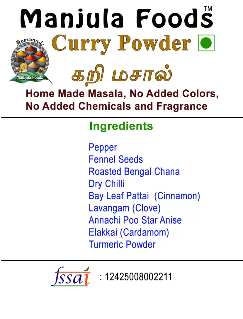 Ingredients: Black Pepper, Fennel Seeds, Roasted Bengal Gram (Chana), Dry Red Chilli, Bay Leaf (Pattai / Cinnamon Leaf), Cinnamon (Pattai), Cloves (Lavangam), Star Anise (Annachi Poo), Cardamom (Elakkai), Turmeric Powder